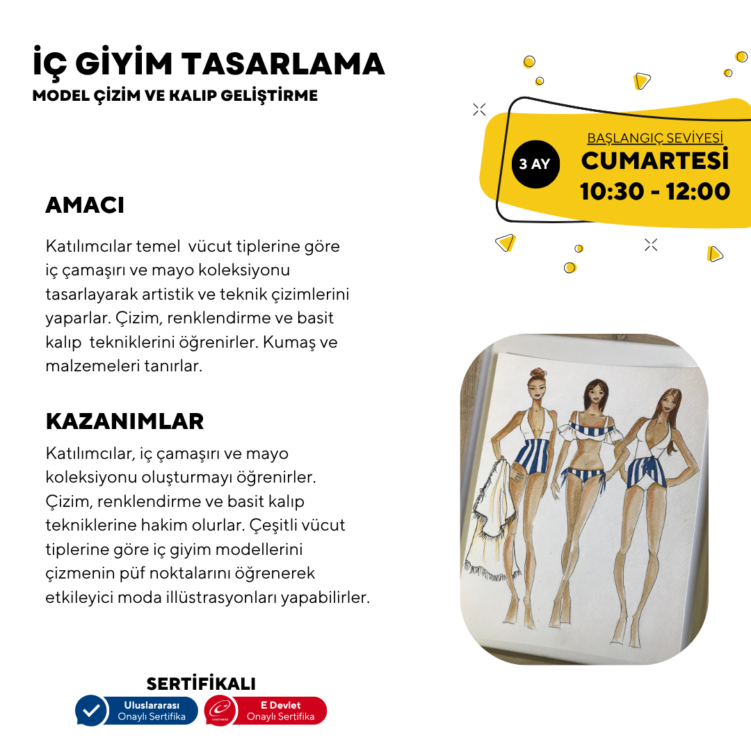 Participants design lingerie and swimsuit collections based on basic body types and create artistic and technical drawings. They learn drawing, coloring, and basic pattern techniques. They also become familiar with fabrics and materials.