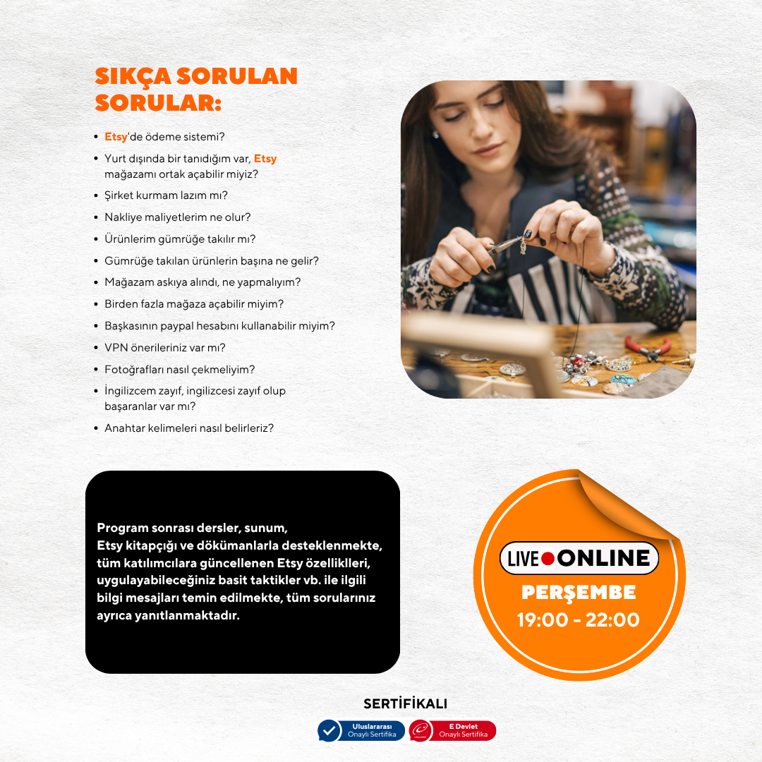 We will cover many topics at a basic level, such as Starting with the Right Product, Opening and Managing a Store on Etsy, Panels, Etsy SEO, Payment Systems, Logistics Processes and Partners, Packaging, Cost and Profitability Analysis, Campaign Management, and Sales Location-Social Media Integration.