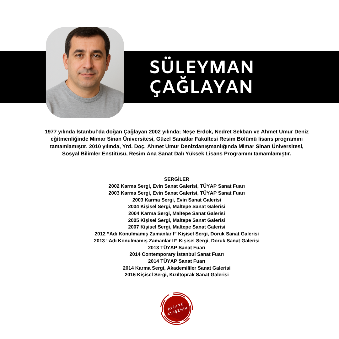 Born in Istanbul in 1977, Çağlayan completed his undergraduate program in the Painting Department of the Faculty of Fine Arts at Mimar Sinan University in 2002 under the tutelage of Neşe Erdok, Nedret Sekban and Ahmet Umur Deniz. In 2010, he became an Assoc. She completed the Master's Program in Painting at Mimar Sinan University, Institute of Social Sciences, under the supervision of Ahmet Umur Deniz. EXHIBITIONS 2002 Group Exhibition, Evin Art Gallery, TÜYAP Art Fair 2003 Group Exhibition, Evin Art Gallery, TÜYAP Art Fair 2003 Group Exhibition, Evin Art Gallery 2004 Personal Exhibition, Maltepe Art Gallery 2004 Group Exhibition, Maltepe Art Gallery 2005 Personal Exhibition, Maltepe Art Gallery 2007 Personal Exhibition, Maltepe Art Gallery 2012 "Unnamed Times I" Personal Exhibition, Doruk Art Gallery 2013 "Unnamed Times II" Personal Exhibition, Doruk Art Gallery 2013 TÜYAP Art Fair 2014 Contemporary Istanbul Art Fair 2014 TÜYAP Art Fair 2014 Group Exhibition, Akademililer Art Gallery 2016 Personal Exhibition, Kızıltoprak Art Gallery