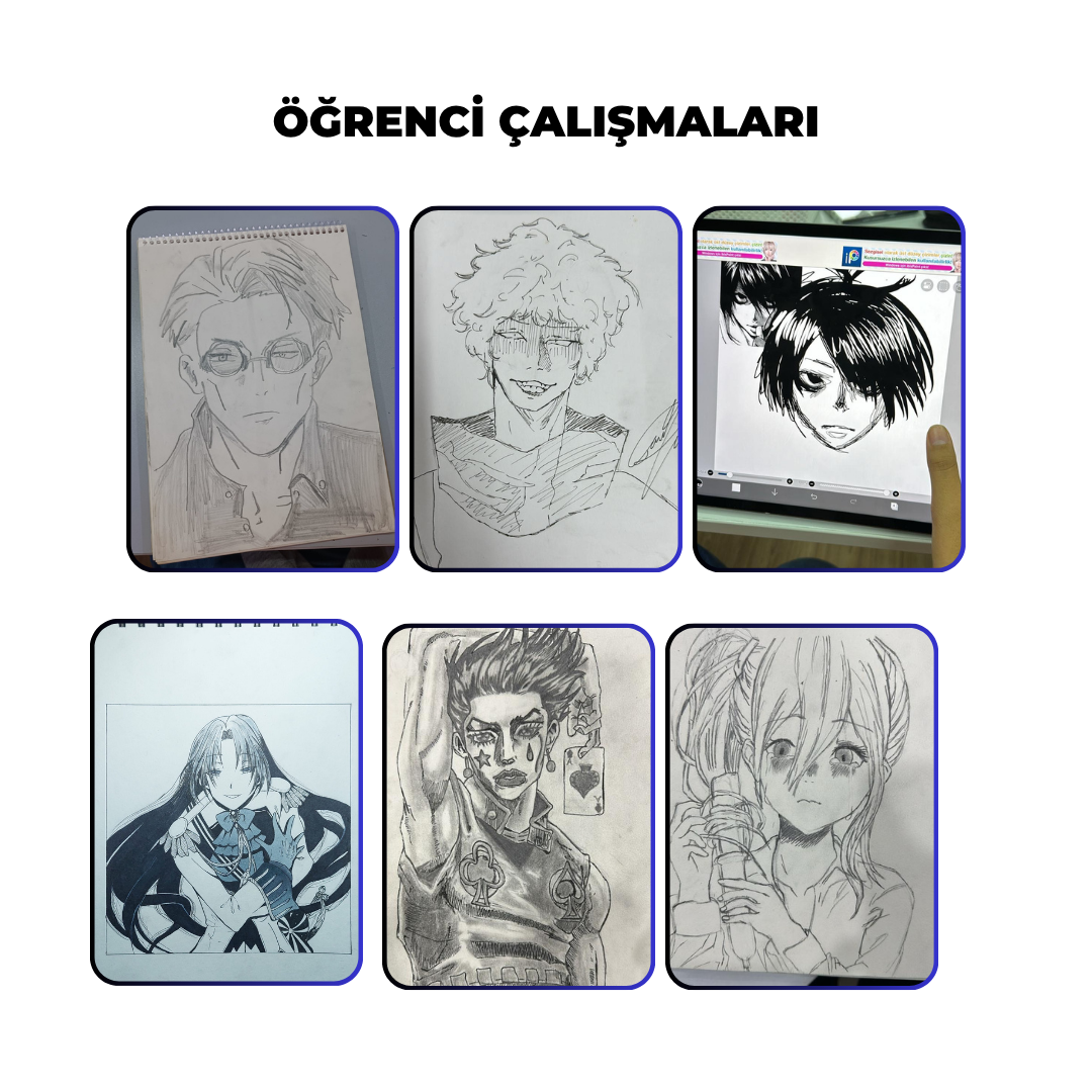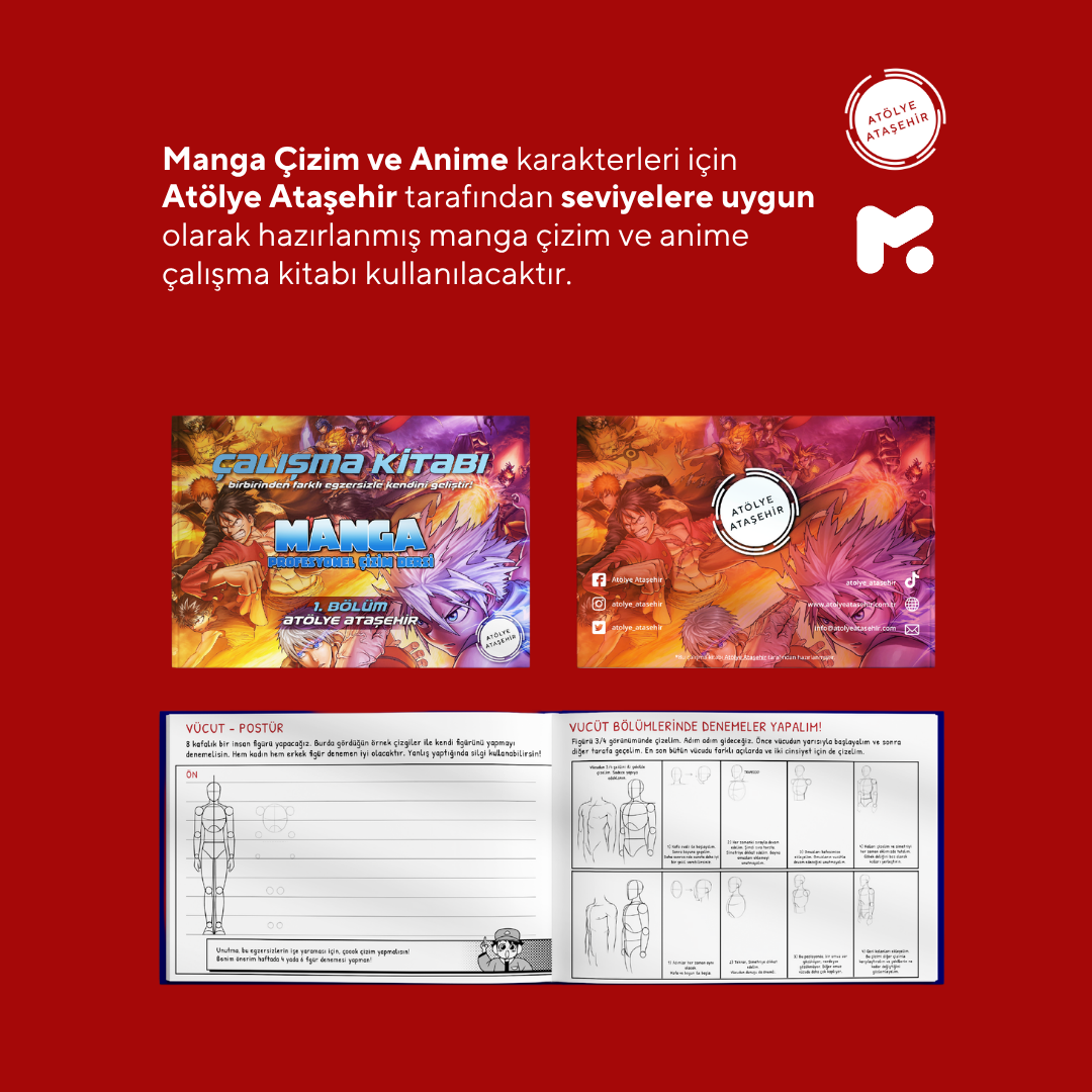 For Manga Drawing and Anime Characters, the manga drawing and anime workbook prepared by Atölye Ataşehir in accordance with the levels will be used.