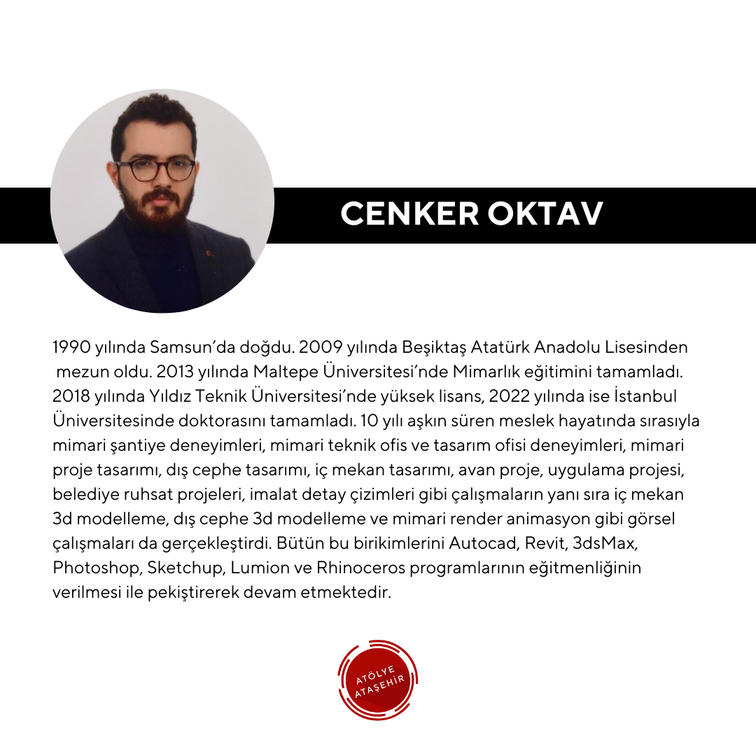 Born in Samsun in 1990, he graduated from Beşiktaş Atatürk Anatolian High School in 2009. He completed his architecture education at Maltepe University in 2013. He completed his master's degree at Yıldız Technical University in 2018, and his doctorate at Istanbul University in 2022. In his professional career spanning over 10 years, he has worked on architectural construction sites, architectural technical offices and design offices, and has undertaken projects such as architectural project design, exterior design, interior design, preliminary projects, construction projects, municipal permit projects, and manufacturing detail drawings, as well as visual works such as interior 3D modeling, exterior 3D modeling, and architectural rendered animation. He continues to consolidate all this knowledge by providing instruction in AutoCAD, Revit, 3dsMax, Photoshop, Sketchup, Lumion, and Rhinoceros.