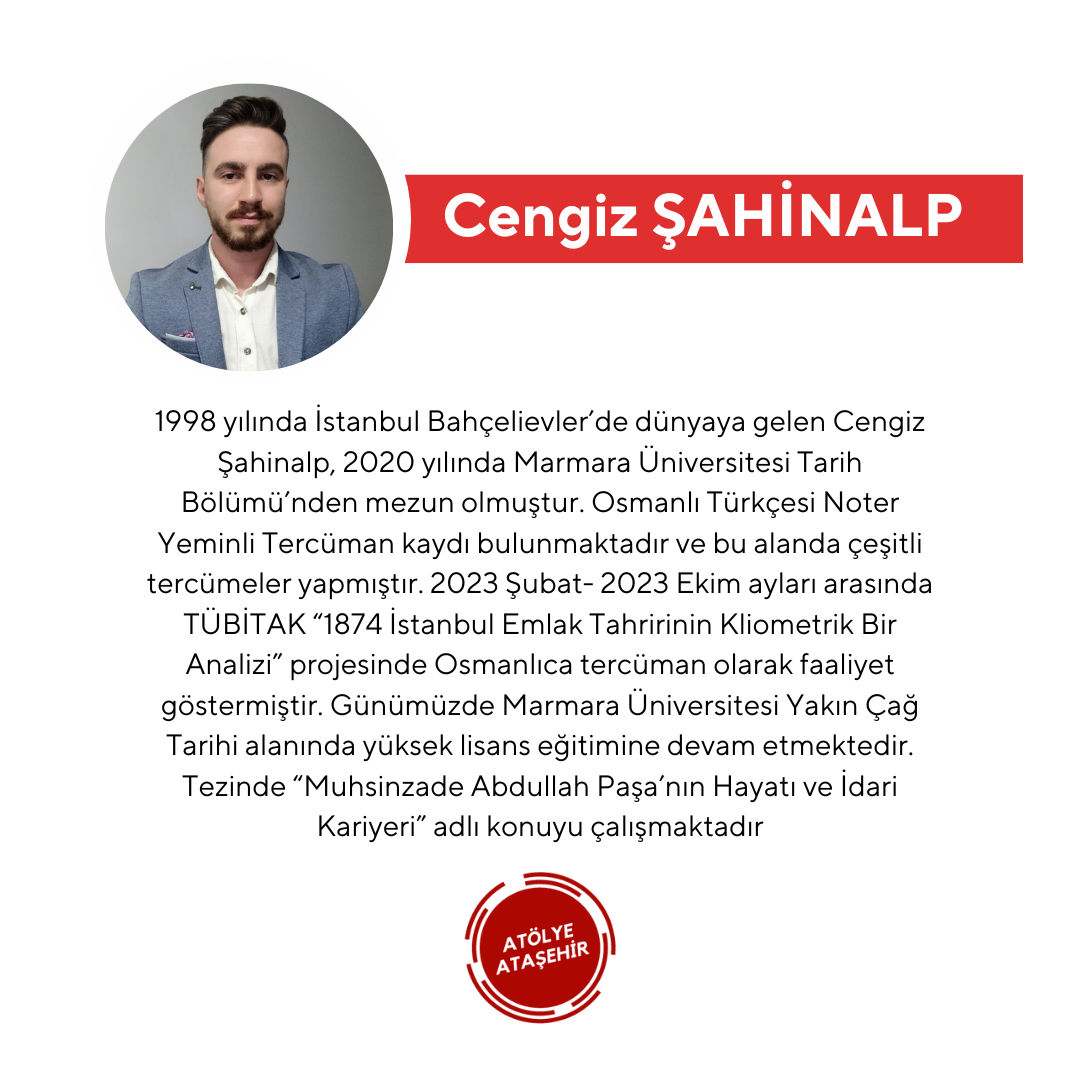 Born in 1998 in Bahçelievler, Istanbul, Cengiz Şahinalp graduated from the History Department of Marmara University in 2020. He is registered as a Notary-Sworn Translator of Ottoman Turkish and has made various translations in this field. Between February 2023 and October 2023, he worked as an Ottoman translator for the TÜBİTAK project "A Cliometric Analysis of the 1874 Istanbul Real Estate Survey." He is currently pursuing his master's degree in Contemporary History at Marmara University. His thesis is titled "The Life and Administrative Career of Muhsinzade Abdullah Pasha."