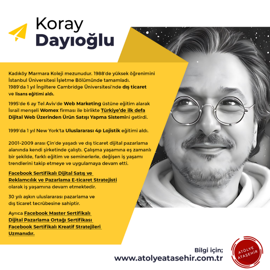 * He lived in China between 2001 and 2009 and worked at his own company in the field of foreign trade digital marketing. Simultaneously with his professional life, he continued to follow and implement changing business trends through various trainings and seminars. He continues his career as a "Facebook Certified Digital Sales and Advertising and Marketing E-Commerce Strategist."