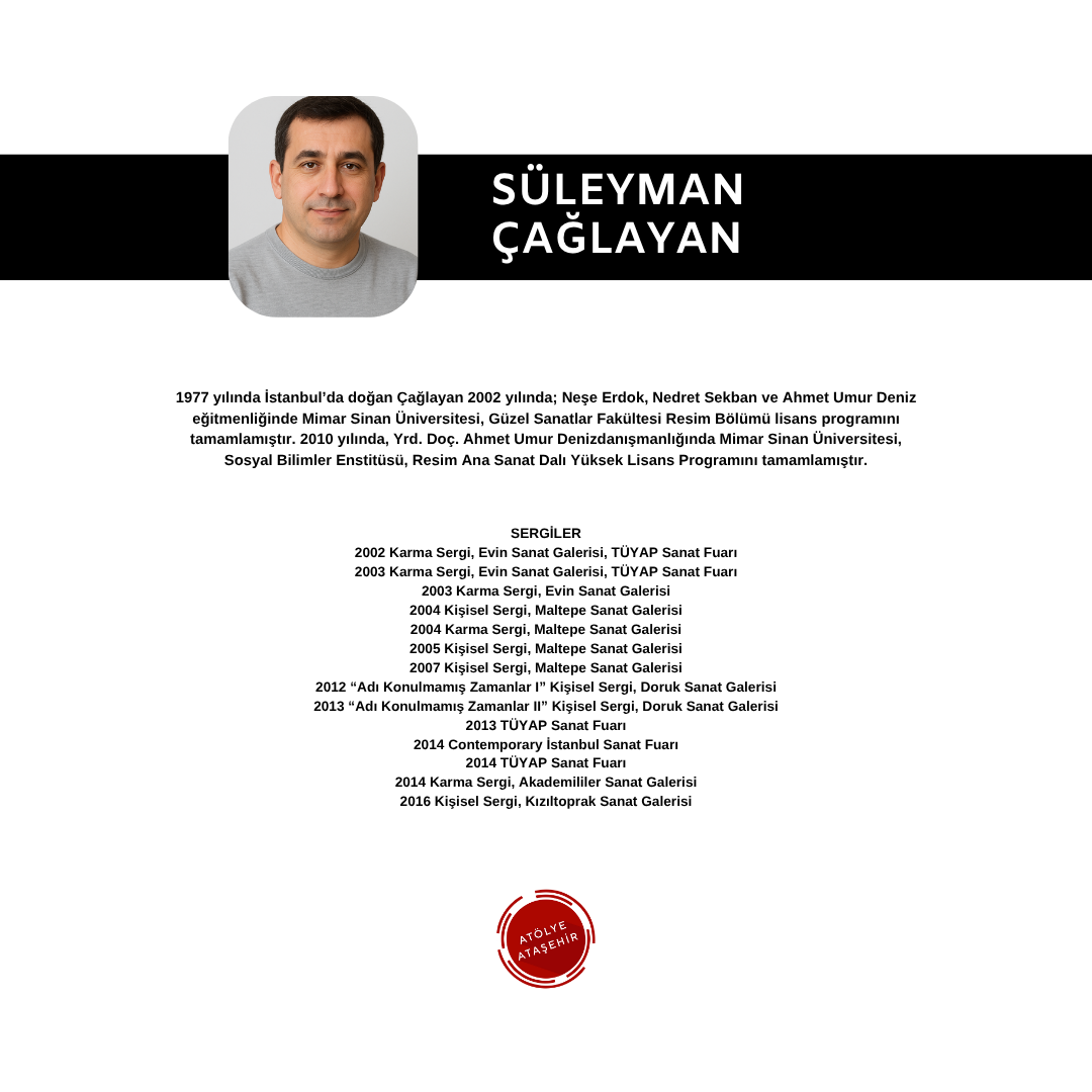 Born in Istanbul in 1977, Çağlayan completed his undergraduate program in the Painting Department of the Faculty of Fine Arts at Mimar Sinan University in 2002 under the tutelage of Neşe Erdok, Nedret Sekban and Ahmet Umur Deniz. In 2010, he became an Assoc. She completed the Master's Program in Painting at Mimar Sinan University, Institute of Social Sciences, under the supervision of Ahmet Umur Deniz. EXHIBITIONS 2002 Group Exhibition, Evin Art Gallery, TÜYAP Art Fair 2003 Group Exhibition, Evin Art Gallery, TÜYAP Art Fair 2003 Group Exhibition, Evin Art Gallery 2004 Personal Exhibition, Maltepe Art Gallery 2004 Group Exhibition, Maltepe Art Gallery 2005 Personal Exhibition, Maltepe Art Gallery 2007 Personal Exhibition, Maltepe Art Gallery 2012 "Unnamed Times I" Personal Exhibition, Doruk Art Gallery 2013 "Unnamed Times II" Personal Exhibition, Doruk Art Gallery 2013 TÜYAP Art Fair 2014 Contemporary Istanbul Art Fair 2014 TÜYAP Art Fair 2014 Group Exhibition, Akademililer Art Gallery 2016 Personal Exhibition, Kızıltoprak Art Gallery