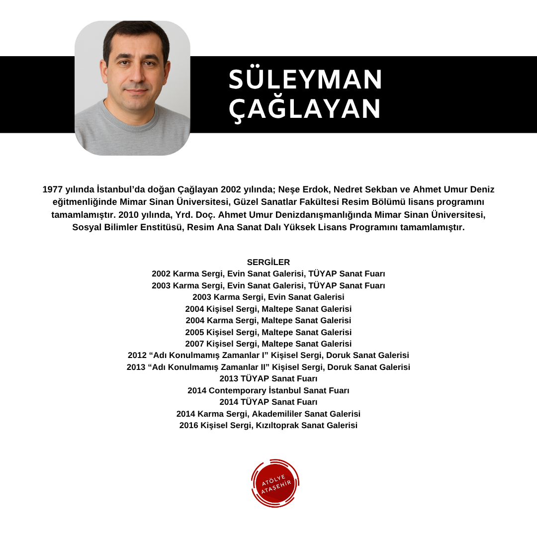 Born in Istanbul in 1977, Çağlayan completed his undergraduate program in the Painting Department of the Faculty of Fine Arts at Mimar Sinan University in 2002 under the tutelage of Neşe Erdok, Nedret Sekban and Ahmet Umur Deniz. In 2010, he became an Assoc. She completed the Master's Program in Painting at Mimar Sinan University, Institute of Social Sciences, under the supervision of Ahmet Umur Deniz. EXHIBITIONS 2002 Group Exhibition, Evin Art Gallery, TÜYAP Art Fair 2003 Group Exhibition, Evin Art Gallery, TÜYAP Art Fair 2003 Group Exhibition, Evin Art Gallery 2004 Personal Exhibition, Maltepe Art Gallery 2004 Group Exhibition, Maltepe Art Gallery 2005 Personal Exhibition, Maltepe Art Gallery 2007 Personal Exhibition, Maltepe Art Gallery 2012 "Unnamed Times I" Personal Exhibition, Doruk Art Gallery 2013 "Unnamed Times II" Personal Exhibition, Doruk Art Gallery 2013 TÜYAP Art Fair 2014 Contemporary Istanbul Art Fair 2014 TÜYAP Art Fair 2014 Group Exhibition, Akademililer Art Gallery 2016 Personal Exhibition, Kızıltoprak Art Gallery