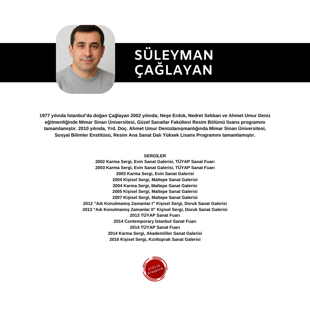 Born in Istanbul in 1977, Çağlayan completed his undergraduate program in the Painting Department of the Faculty of Fine Arts at Mimar Sinan University in 2002 under the tutelage of Neşe Erdok, Nedret Sekban and Ahmet Umur Deniz. In 2010, he became an Assoc. She completed the Master's Program in Painting at Mimar Sinan University, Institute of Social Sciences, under the supervision of Ahmet Umur Deniz. EXHIBITIONS 2002 Group Exhibition, Evin Art Gallery, TÜYAP Art Fair 2003 Group Exhibition, Evin Art Gallery, TÜYAP Art Fair 2003 Group Exhibition, Evin Art Gallery 2004 Personal Exhibition, Maltepe Art Gallery 2004 Group Exhibition, Maltepe Art Gallery 2005 Personal Exhibition, Maltepe Art Gallery 2007 Personal Exhibition, Maltepe Art Gallery 2012 "Unnamed Times I" Personal Exhibition, Doruk Art Gallery 2013 "Unnamed Times II" Personal Exhibition, Doruk Art Gallery 2013 TÜYAP Art Fair 2014 Contemporary Istanbul Art Fair 2014 TÜYAP Art Fair 2014 Group Exhibition, Akademililer Art Gallery 2016 Personal Exhibition, Kızıltoprak Art Gallery