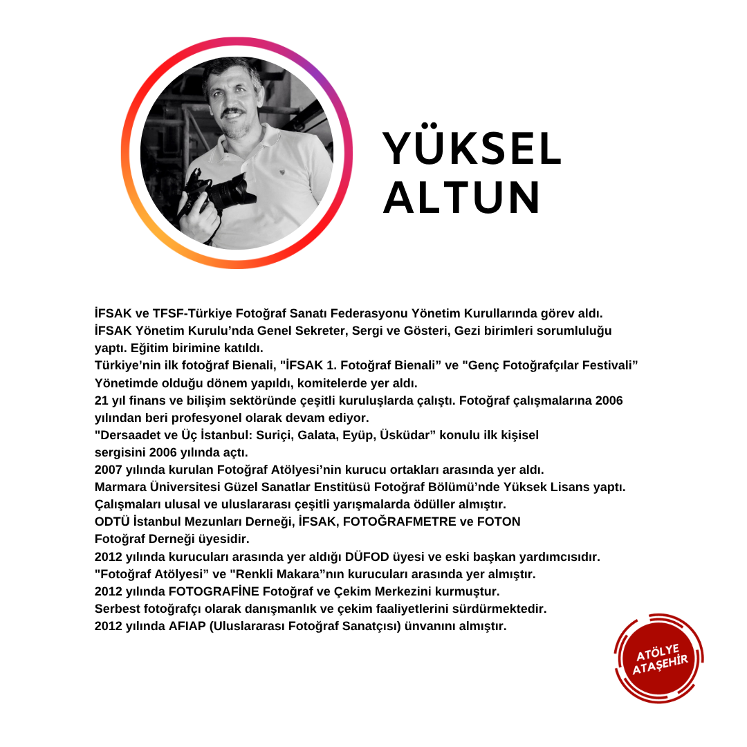 He is a member of METU Istanbul Alumni Association, IFSAK, FOTOĞRAFMETRE and FOTON Photography Association.