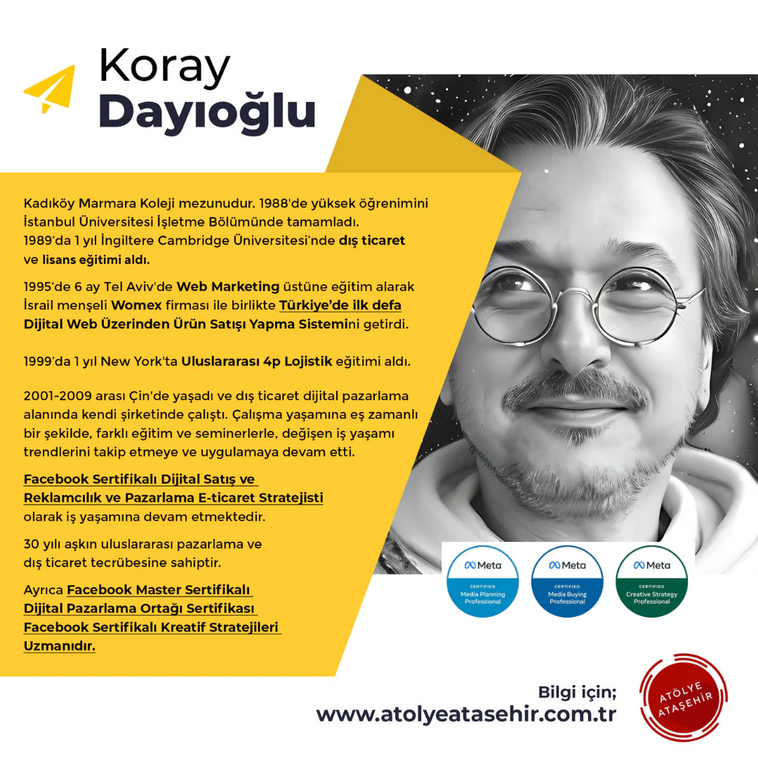 * He lived in China between 2001 and 2009 and worked at his own company in the field of foreign trade digital marketing. Simultaneously with his professional life, he continued to follow and implement changing business trends through various trainings and seminars. He continues his career as a "Facebook Certified Digital Sales and Advertising and Marketing E-Commerce Strategist."
