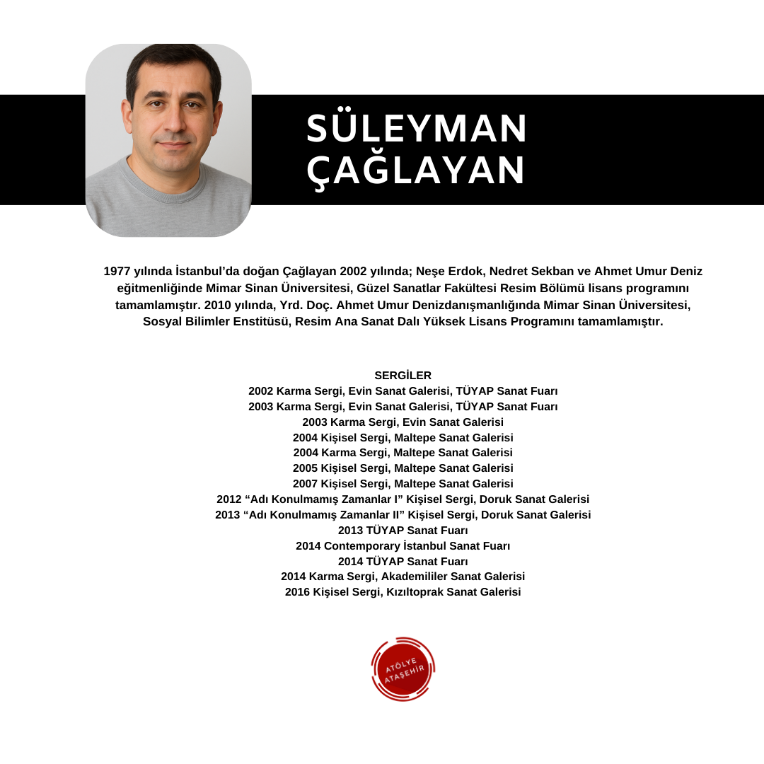 Süleyman Çağlayan was born in Istanbul in 1977. He completed his undergraduate program in the Painting Department of the Faculty of Fine Arts at Mimar Sinan University in 2002, under the tutelage of Neşe Erdok, Nedret Sekban, and Ahmet Umur Deniz. In 2010, he became Assoc. He completed the Master's Program in Painting at Mimar Sinan University, Institute of Social Sciences, under the supervision of Ahmet Umur Deniz. EXHIBITIONS 2002 Group Exhibition, Evin Art Gallery, TÜYAP Art Fair 2003 Group Exhibition, Evin Art Gallery, TÜYAP Art Fair 2003 Group Exhibition, Evin Art Gallery 2004 Personal Exhibition, Maltepe Art Gallery 2004 Group Exhibition, Maltepe Art Gallery 2005 Personal Exhibition, Maltepe Art Gallery 2007 Personal Exhibition, Maltepe Art Gallery 2012 "Unnamed Times I" Personal Exhibition, Doruk Art Gallery 2013 "Unnamed Times II" Personal Exhibition, Doruk Art Gallery 2013 TÜYAP Art Fair 2014 Contemporary Istanbul Art Fair 2014 TÜYAP Art Fair 2014 Group Exhibition, Akademililer Art Gallery 2016 Personal Exhibition, Kızıltoprak Art Gallery