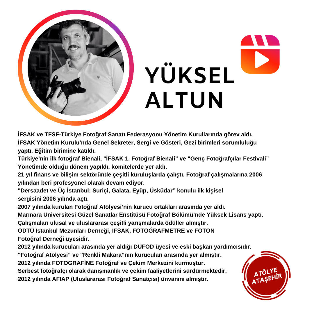 YUKSEL ALTUNHe served on the boards of directors of FSAK and TFSF-Turkish Photographic Arts Federation. He served as General Secretary, responsible for the Exhibition and Show, and Travel units on the IFSAK Board of Directors. He also participated in the education unit.