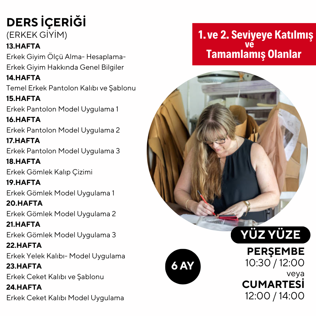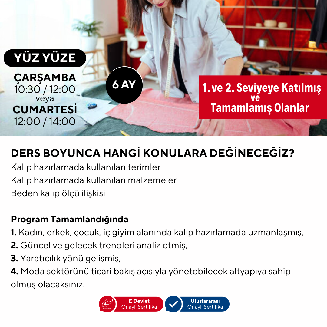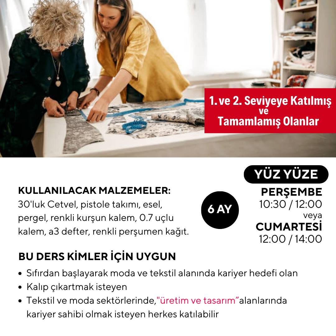(ADVANCED LEVEL) With the training you receive on pattern application techniques, you will have the knowledge and skills to apply patterns for evening dresses, jackets, coats, etc., place the pattern on the fabric and prepare it for sewing.