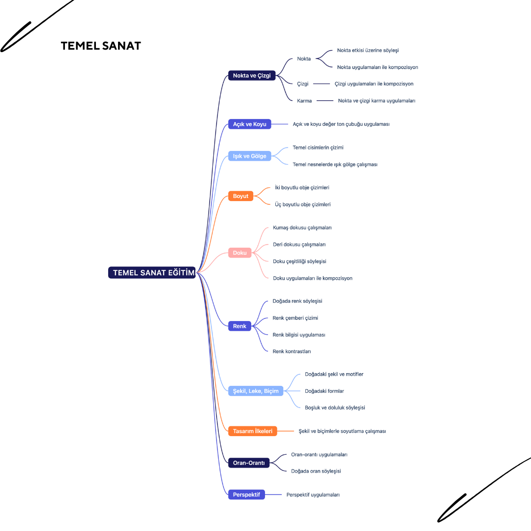 · Temel sanat elemanlarını öğretme: Çizgi, şekil, form, renk, doku, boşluk gibi sanatın temel yapı taşlarını tanıtır.